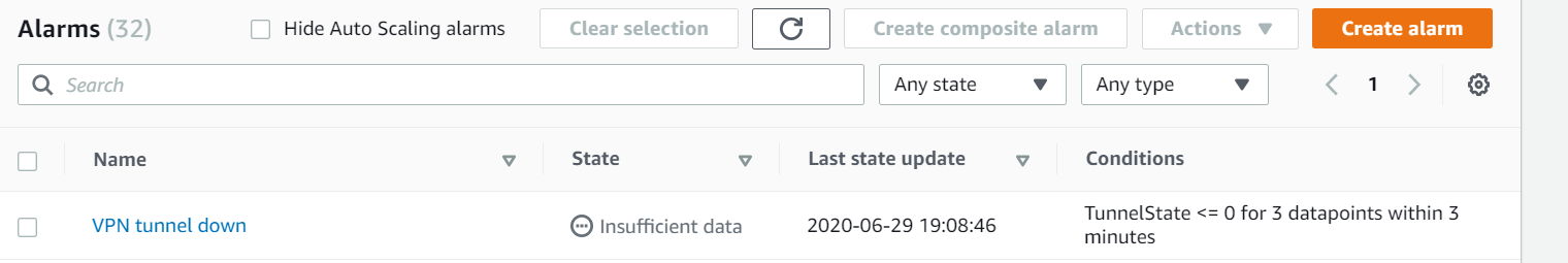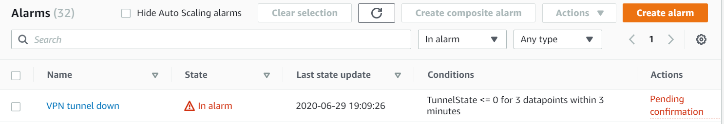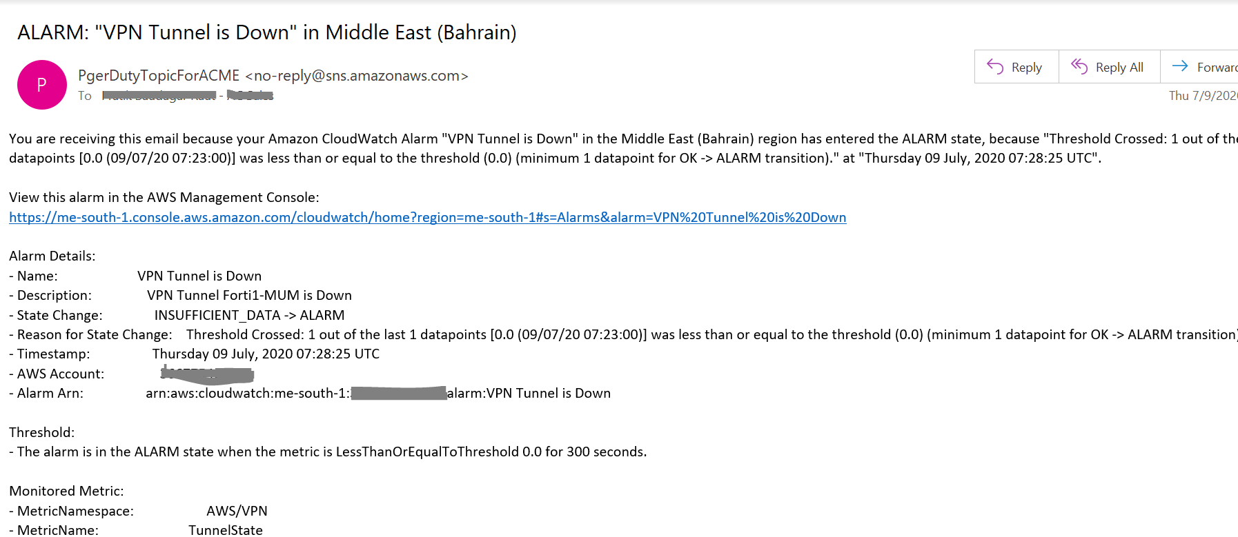It is important to understand and get quick alerts and alarms when VPN tunnel is down as this may lead to big loss at business end. ACME has configured automated notifications to receive when AWS VPN tunnel is down.