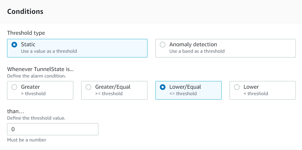 The status of an AWS VPN can be monitored through its metric data, which is automatically sent to CloudWatch. The VPN tunnel state is reported as a Boolean value in the CloudWatch metric TunnelState, where 0 indicates that the tunnel is down and 1 indicates that the tunnel is up. You can set up a CloudWatch alarm based on this CloudWatch metric to notify you when one or both VPN tunnels are down.
