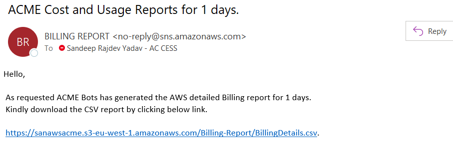 Considering customers’ expectations and the demands ACME has built up a solution which helps customer to interact with their AWS Services efficiently to achieve their objective. Customers want easy and simple way to receive their hourly, daily, weekly and monthly billing reports along with inventory details.